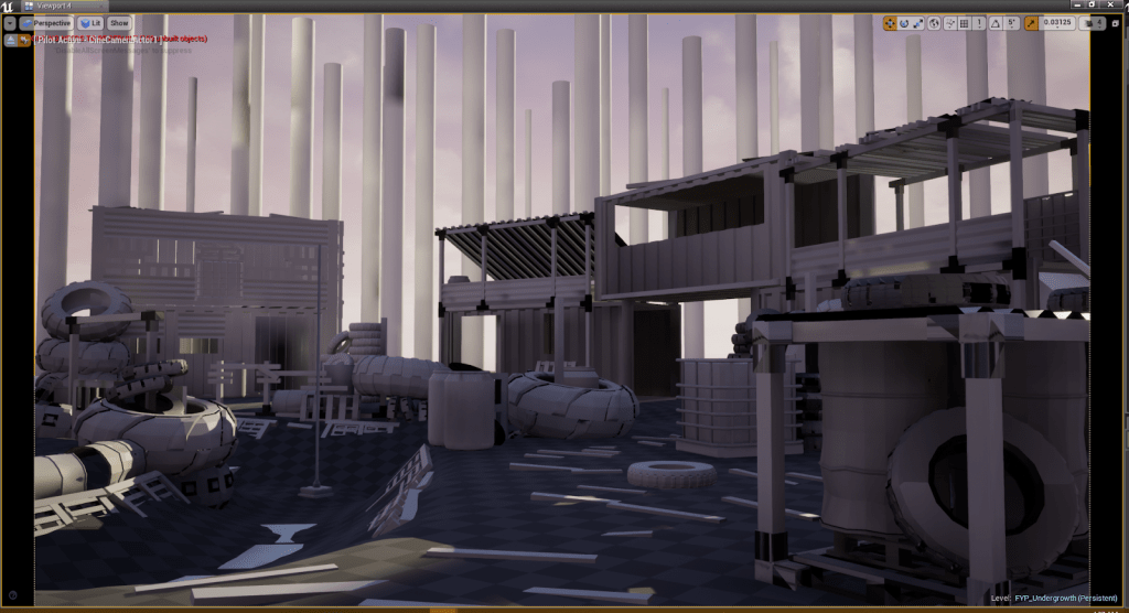 The majority of the models are very simple but combined together they make up the majority of the screen space. I implemented them into unreal replacing the basic primitive block out – not only to portray the scene more visually but to help motivate myself as seen a creation come together piece by piece keeps motivation and rhythm in the creative process.