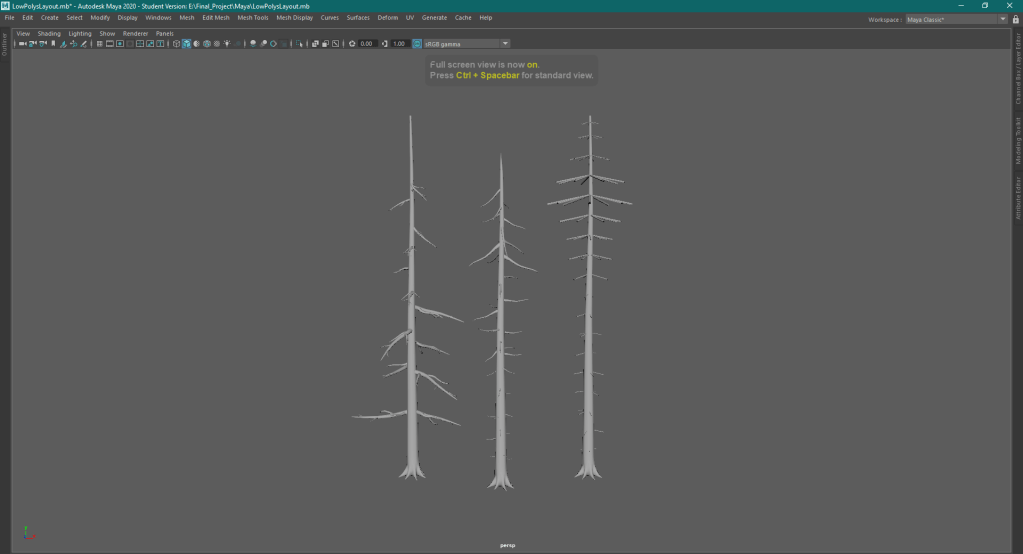 I ended up modeling a few variants of trees both having a different branch layout and style. With the best in my opinion being the middle one However Ill have to address my references to see how im going to incorporate leaves and twigs into the scene and which pipeline im going to head down.